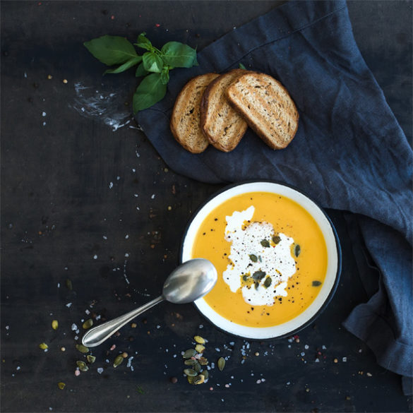 Výbornou dýňovou polévku podáváme se lžičkou kyselé smetany a na talířku zdobíme čerstvou pažitkou a nasekanou bazalkou.